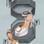 For the traditional bride with a penchant for nuance, the “something blue” comes in the form of finely gathered tulle iterations of the Maureen mule, adding a soft whisper of color to the otherwise pearlescent palette. In a playful nod to ceremony, the Teese platforms are presented nestled within a ring box. Rendered in satin white and beige, they’re crowned with the brand’s signature crystal crest, a contemporary flourish on classic bridalwear.