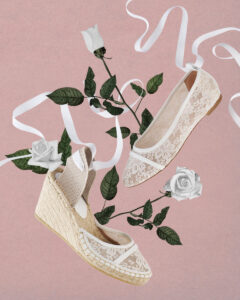 True to Malone Souliers’ DNA, the collection champions romantic femininity and artisanal detail. Familiar silhouettes such as the Monroe pump, Maureen mule, and Noah sandal are delicately cloaked in white lace—a fabric chosen not only for its visual charm but also for its tactile softness and vintage bridal associations. Meanwhile, newcomers like the Selen espadrille and Sabina ballet flat speak to a more relaxed elegance, ideal for countryside weddings, after-parties, or refined receptions under the stars.