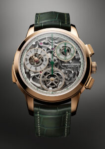 The transparent sapphire dial, barely 0.5mm thick, is frosted and polished in intricate harmony. The hour markers, subtly treated with grey NAC, echo against the olive green chronograph hands and matching alligator strap. Even the back of the watch is a canvas of horological poetry: its blackened bridges sandblasted and mirror-polished, its governor engraved with a tribute to Jean-Marc Vacheron himself.