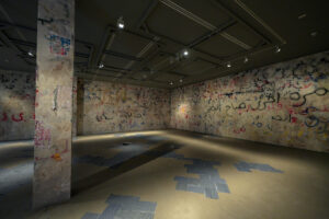 Floor: Khaled Esguerra, Heritage Legacy Authentic (2025); walls: Salma Dib, Generational Wall: Orders and Echoes (2025). Installation view of No Trespassing at Ishara Art Foundation, 2025. Image courtesy of Ishara Art Foundation and the artists. Photography by Faraz Khan