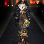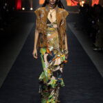 The signature Etro print finds new, dynamic life and is refracted through beaded fringes, run across studded leather biker jackets, and layered in metallic jacquards that overlap with rhythmic motifs. Colour explodes not in broad strokes, but in precise, contrasting eruptions, in the multicoloured inlays on a leather blouson, in the pictorial motifs flourishing on rich brocades, and then, a sudden, brilliant black shadow cuts through the palette.