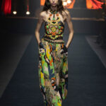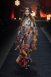 In the Flux, everything blends, yet nothing is lost, the eye is invited on a perpetual detour, discovering the dialogue between opposites: impalpable shapes that wrap and twist are accentuated by ruffles and kinetic fringes, while elsewhere, precise tailoring is illuminated by silky shimmers. Craft is paramount, expressed in delicate crochet and strategic transparencies that reveal flashes of skin, reminding us of the human form beneath the artistry.