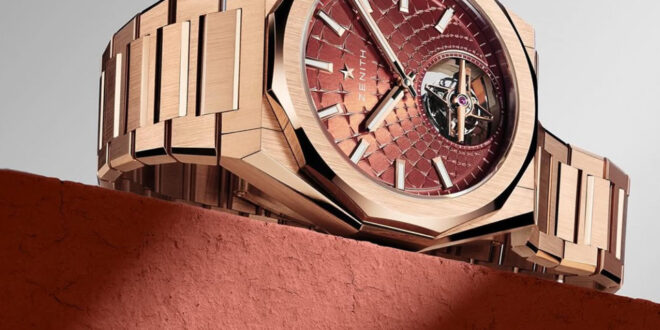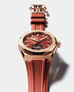 The watch is presented on an integrated rose gold H-link bracelet, complemented by an additional brick-red rubber strap. Both are equipped with Zenith’s tool-free quick-change system, allowing the wearer to shift seamlessly from formal elegance to a more sporty, casual demeanor in moments.