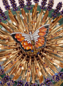 The body of the butterfly is carved from tiger’s eye and accented with amethyst cabochon eyes and diamond-punctuated antennae. After its brief, graceful flight above a cluster of amethyst-set golden beads, it retreats, and the bouquet gently closes around it, completing a 20-second cycle of pure enchantment.