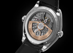 The movement’s finishing is visible through the sapphire crystal case back, the bridges, treated with a dark NAC coating, are adorned with embossed rays that alternate between brushed and micro-beaded finishes. Each beveled edge is meticulously polished to catch the light from every angle. The openworked, 5N red gold-plated oscillating weight, bearing the signature rhodium-plated helix logo, is engraved with the Cyrus Genève motto, “The Conquest of Innovation”, a fitting creed for a timepiece of such ambition.
