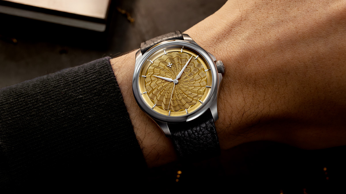 Alpha: A gold-toned galvanic finish that echoes the city’s ornamental heritage, paired with a black calfskin strap.