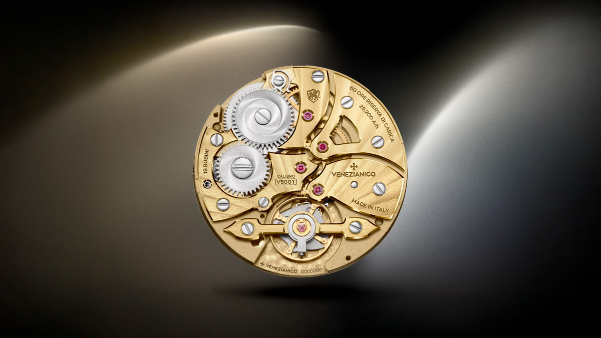 At the core of the Redentore Utopia II beats the V5001 caliber, developed in collaboration with OISA and designed by Fausto Berizzi and Andrea Menegazzo, the technical director of Venezianico. While its architecture remains faithful to the preceding V5000, retaining a slim 3.5 mm profile, a 60-hour power reserve, and a precision of ±3 seconds per day, the V5001 elevates finishing to an art form. Bridges and the mainplate are treated with a 24-carat gold galvanic coating, complemented by radial Côtes de Genève, fine perlage, and double-snailing on the wheels. Even components hidden from view receive meticulous attention, reflecting a philosophy where every part contributes to both performance and aesthetics.