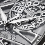 The trapezoidal hour and minute hands, faceted and rhodium-coated, are filled with white Super-LumiNova, ensuring readability without compromising the watch’s restrained aesthetic. And then there is the crystal, a generous box sapphire that not only protects but invites. Viewed from the side, it reveals a stratified world of angles, textures, and mechanical processes, each level contributing to a cohesive whole that rewards prolonged observation.