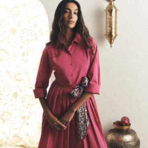 The collection encompasses a thoughtfully assembled edit of dresses, kaftan-inspired silhouettes, and accessories conceived with the rhythms of Ramadan in mind. A palette of warm neutrals and earthy shades, soft sand, terracotta, and warm taupe, is punctuated by subtle metallic accents, evoking the interplay of light and shadow during sacred nights.